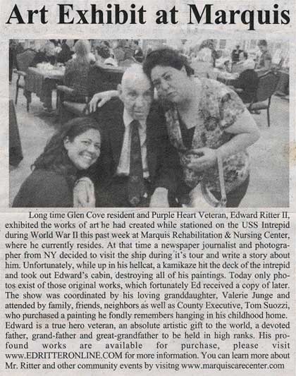 First Annual Art Exibit - Ocean Promenade Rehabilitation and Nursing Center held its First Annual Art Exibit this past season. After a year of weekly Art therapy classes the residents were ready to make their debut. The boardwalk in Rockaway Beach, which had been evacuated only days earlier due to Hurricane Irene, was the ideal backdrop to showcase the beautiful masterpieces. The colorful creations ranged from landscapes and seascapes to the abstract and impressionist movements. Under the tutelage of an Art Therapist residents have been taught traditional techniques and encouraged to reminisce and explore in hopes of tapping into their inner artist. Many residents have stated that they find the painting classes, which are usually accompanied by music while overlooking the ocean, extremely relaxing.
